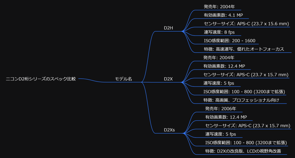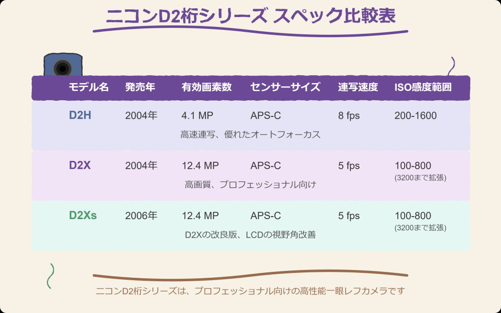 | D2X | 2004年 | 12.4 MP | APS-C (23.7 x 15.7 mm) | 5 fps | 100 – 800 (3200まで拡張) | 高画質、プロフェッショナル向け |