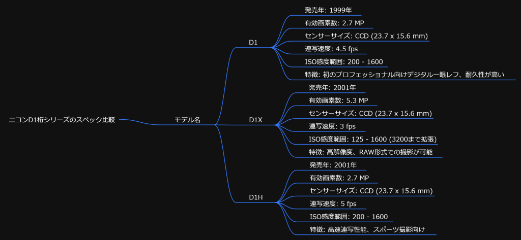 D1X2001年5.3 MPCCD (23.7 x 15.6 mm)3 fps125 – 1600 (3200まで拡張)高解像度、RAW形式での撮影が可能