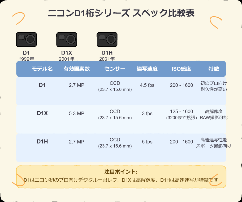 この表は、D1桁シリーズの主要なモデルの比較を簡潔に示しており、各モデルの特性や発売時期を理解するのに役立ちます。