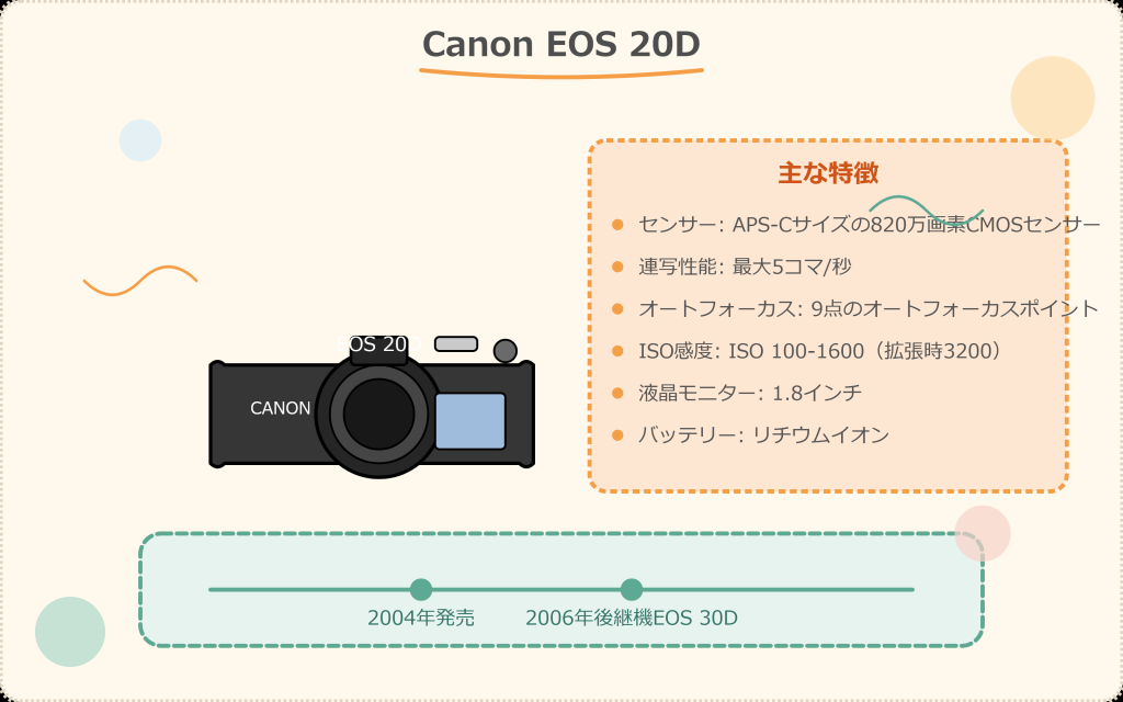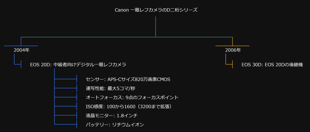 EOS 20Dは2004年9月に発売され、2006年にはその後継機であるEOS 30Dが登場しました。EOS 20Dは、特にその高性能とコストパフォーマンスの良さから、多くのユーザーに支持されました。