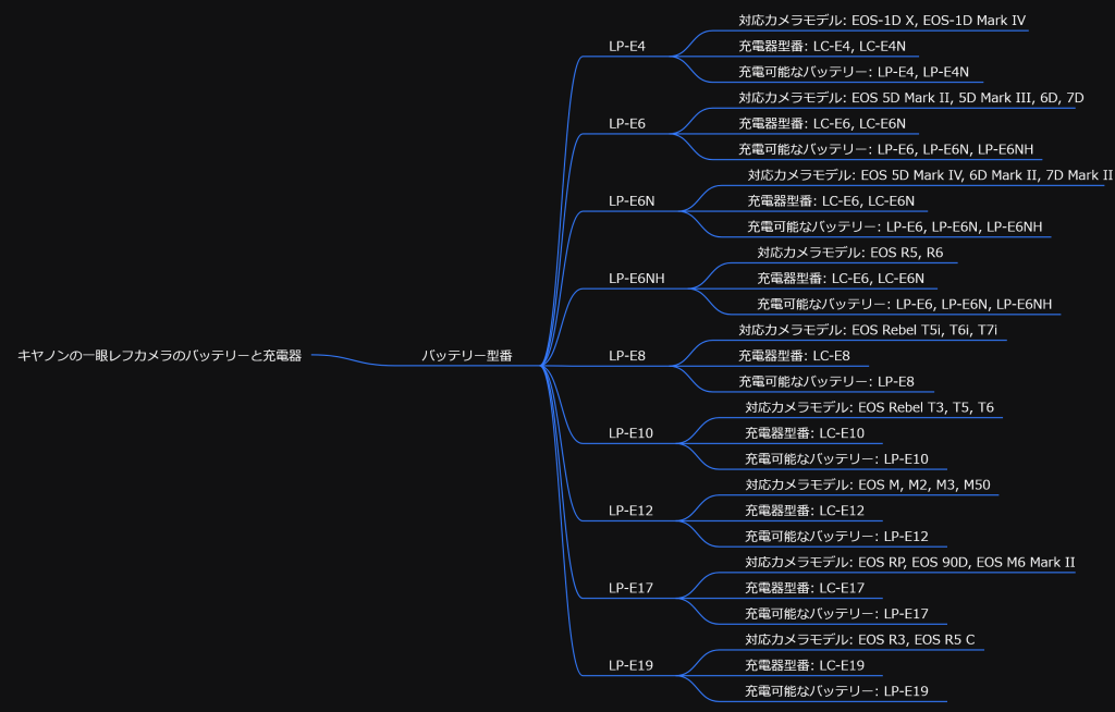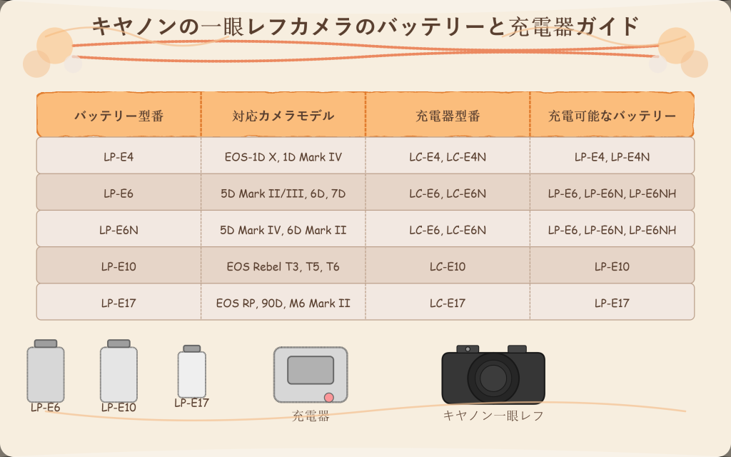 このテーブルは、キヤノンの一眼レフカメラにおけるバッテリーの互換性と充電器の情報を簡潔にまとめたものです。バッテリーの選択や充電器の使用に際して、参考にしてください。