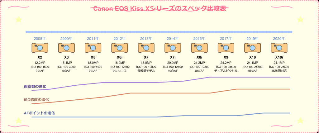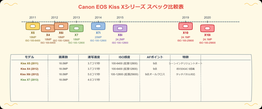 この表は、Canon EOS Kiss Xシリーズの進化を示しており、各モデルの特性を理解するのに役立ちます。