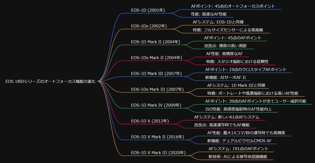 キヤノンのEOS 1桁Dシリーズは、オートフォーカス(AF)機能の進化が顕著であり、各モデルごとにさまざまな改良が施されています。以下に、各モデルのオートフォーカス機能の主な進化点をまとめます。