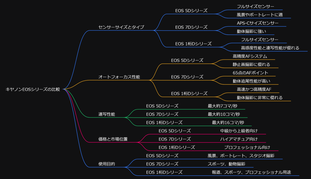 • EOS 5Dシリーズ: フルサイズセンサーを搭載しており、広い画角と高い解像度を提供します。特に風景やポートレート撮影に適しています。