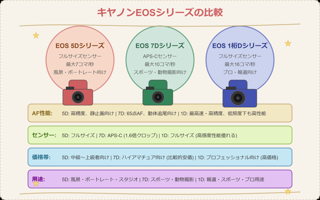 • EOS 7Dシリーズ: ハイアマチュア向けで、APS-Cセンサーを搭載し、動体撮影に特化した性能を持っていますが、フルサイズ機よりも安価です。
