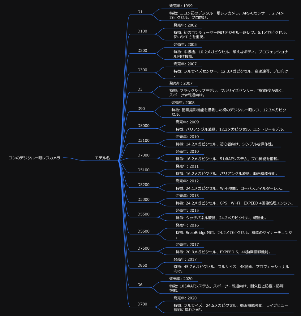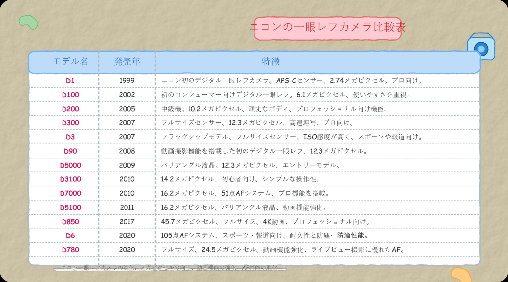 以下は、ニコンのデジタル一眼レフカメラの主なモデルとその発売時期、特徴をまとめたテーブルです。これには、Dシリーズの主要なモデルが含まれています。